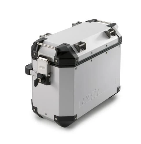 KTM Trekker rechterkoffer. Deze stevige, aluminium koffer is gemaakt van 1,5 mm aluminium en heeft een geborsteld, geanodiseerde finish met het KTM logo. De koffer is voorzien van verstevigde technopolymeer hoeken en heeft een inhoud van 37 liter. De koffer kan maximaal 10 kilo aan gewicht dragen. De KTM Trekker koffer is afsluitbaar en heeft een deksel wat volledig van de koffer ad te halen is. LET OP: Zijkofferdrage 60612912044 is noodzakelijk voor montage, maar is niet meer leverbaar.